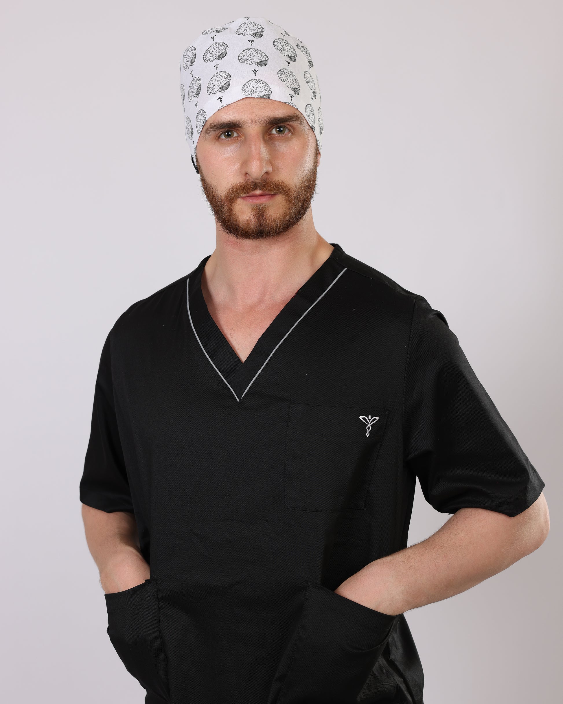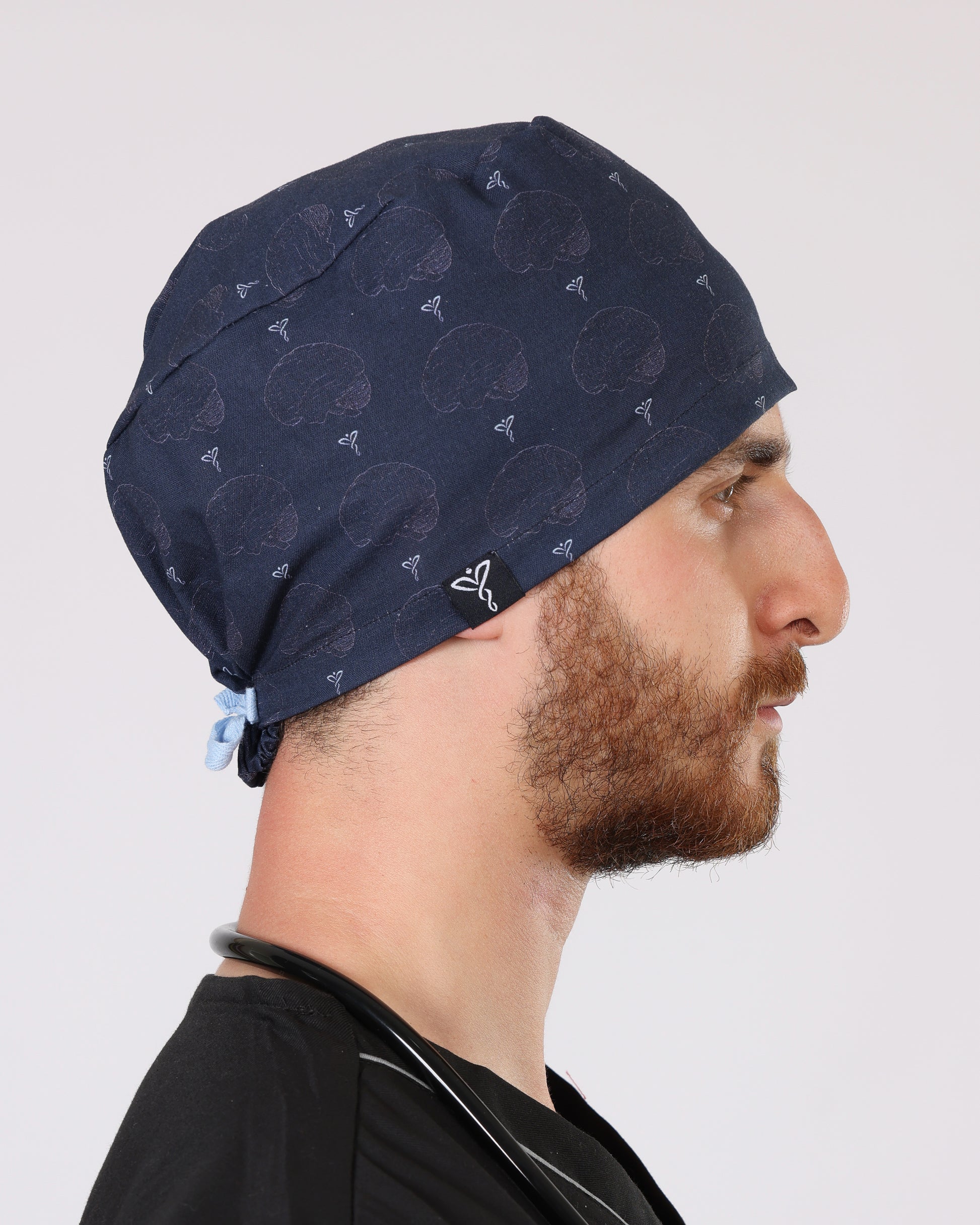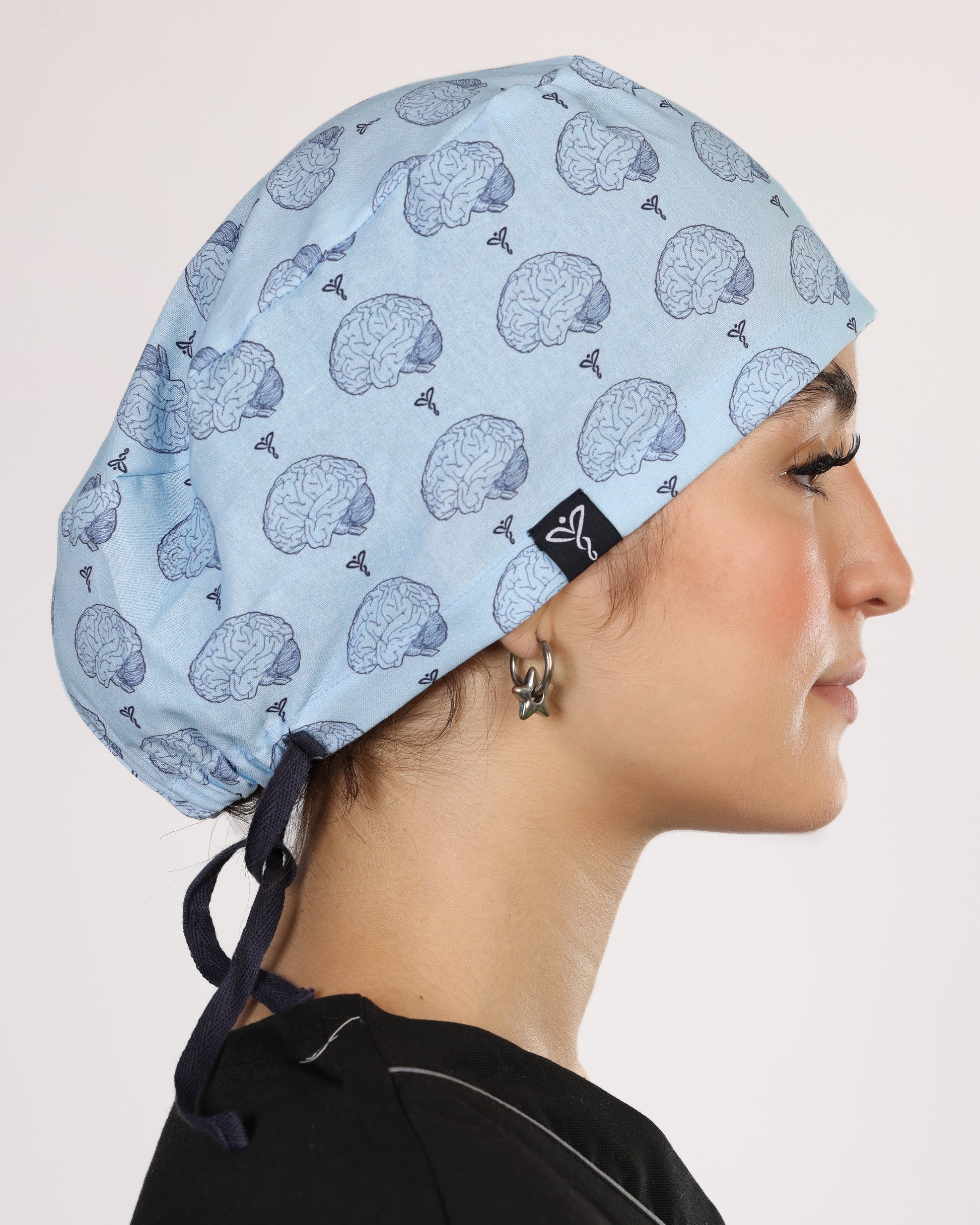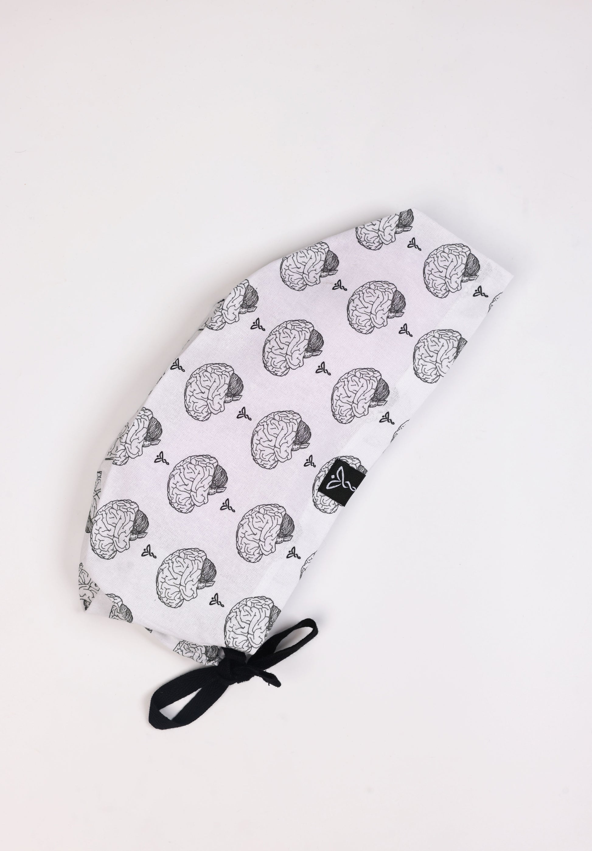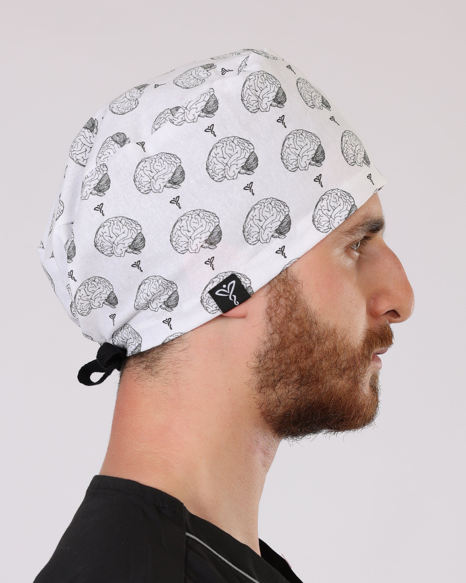 Le modèle Brain mood se distingue par un motif fin et répétitif représentant un cerveau stylisé, dessiné en ligne continue. Imprimé de façon régulière sur tout le calot, ce design sobre et graphique évoque la précision du monde neurologique, avec une touche minimaliste très actuelle.