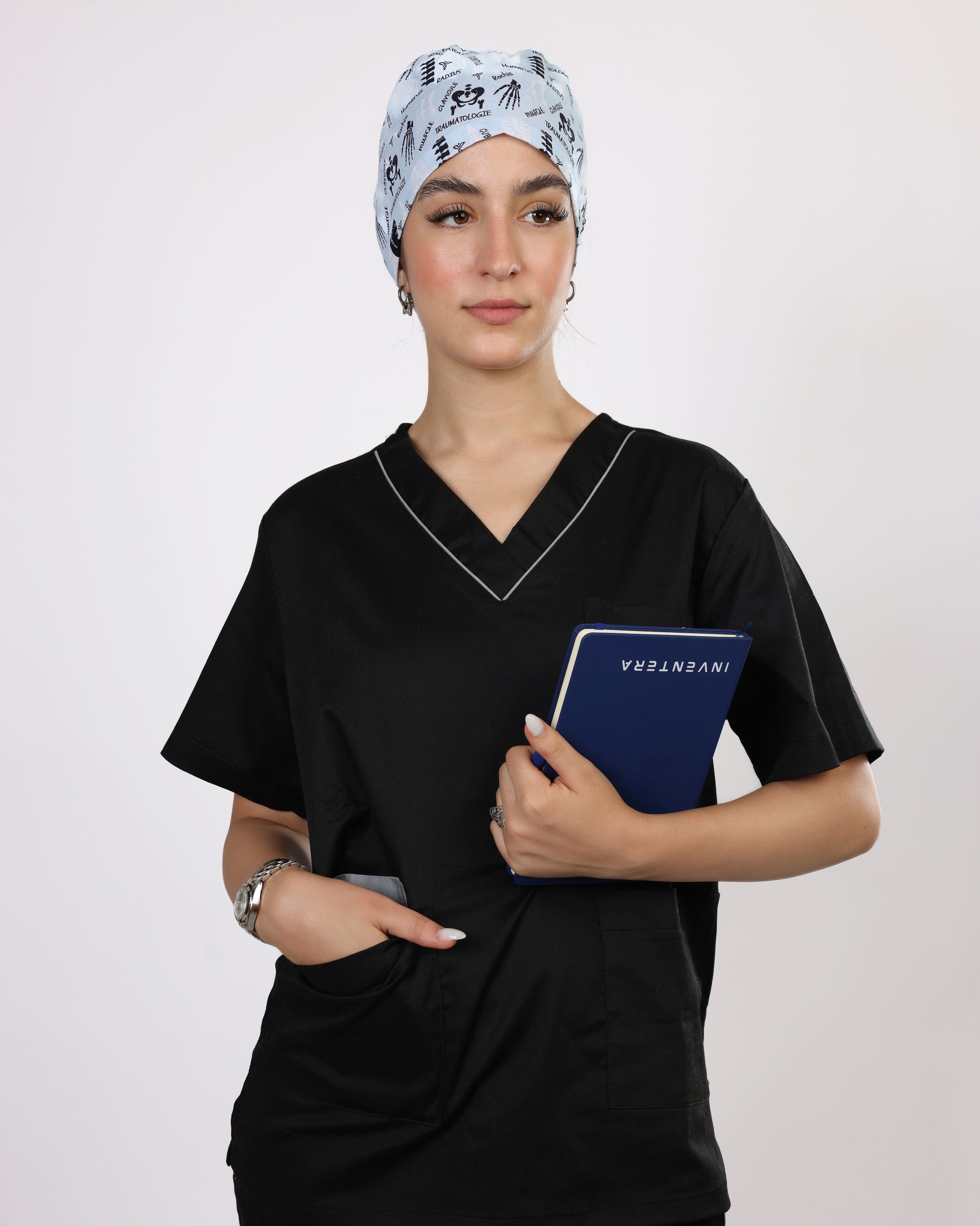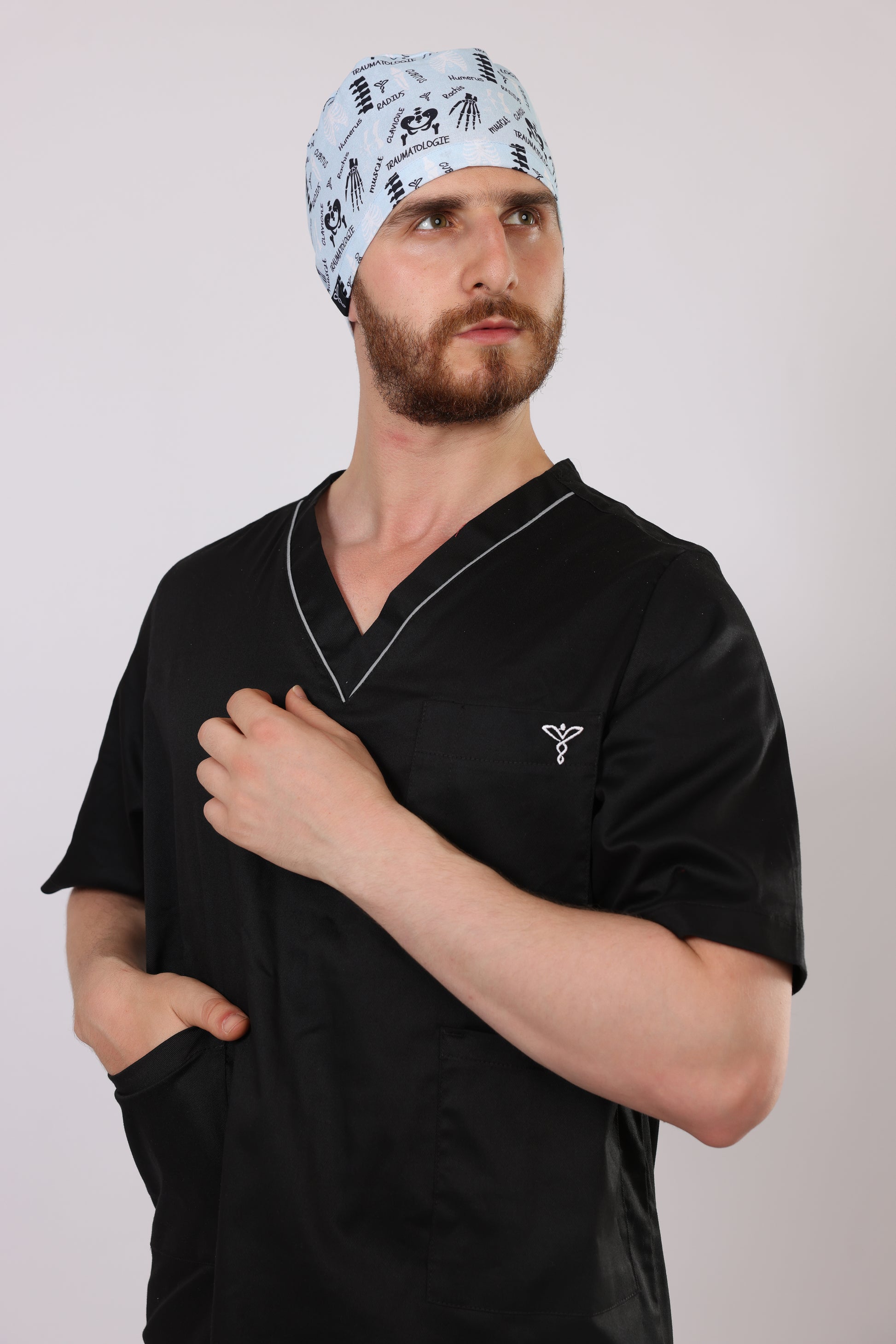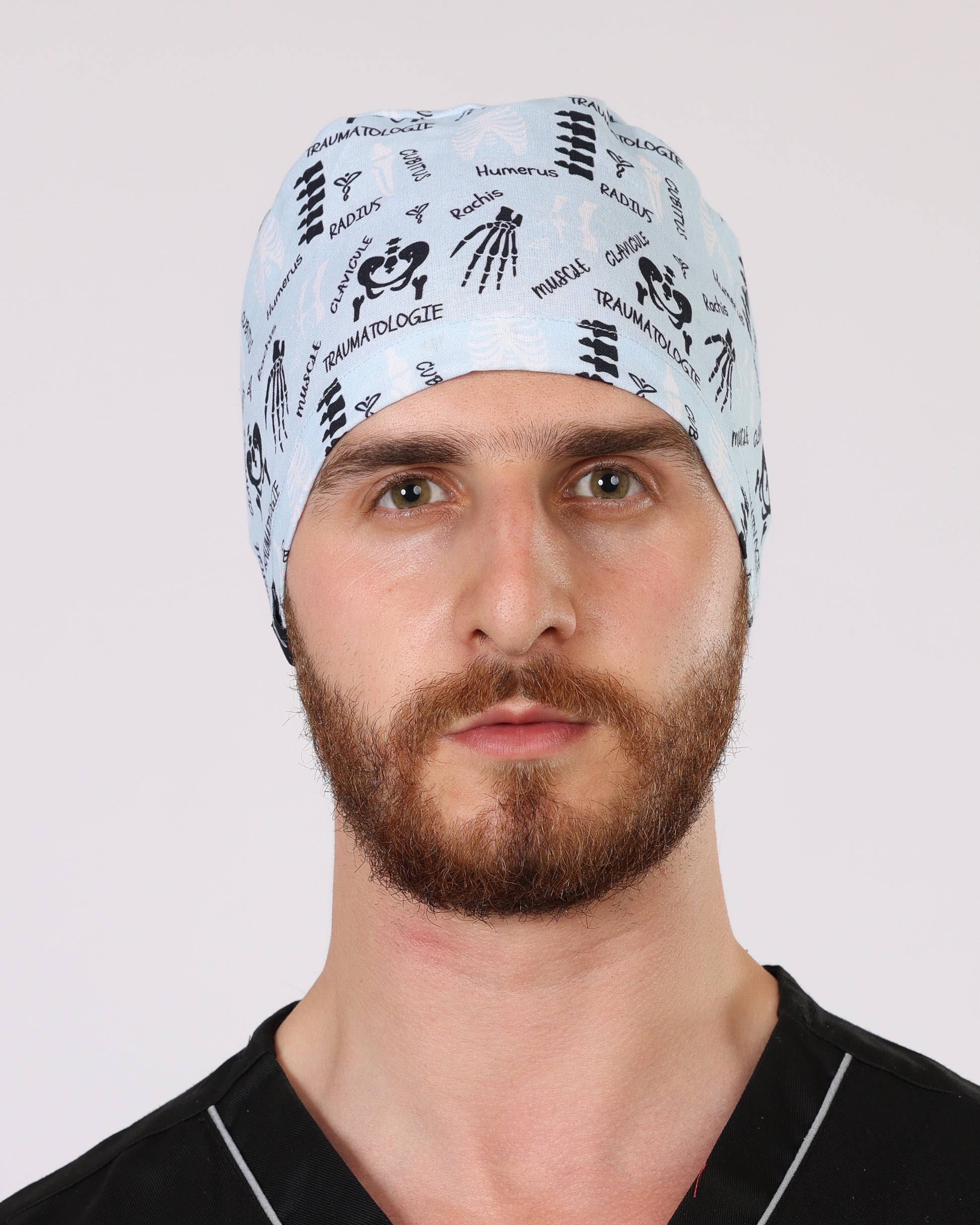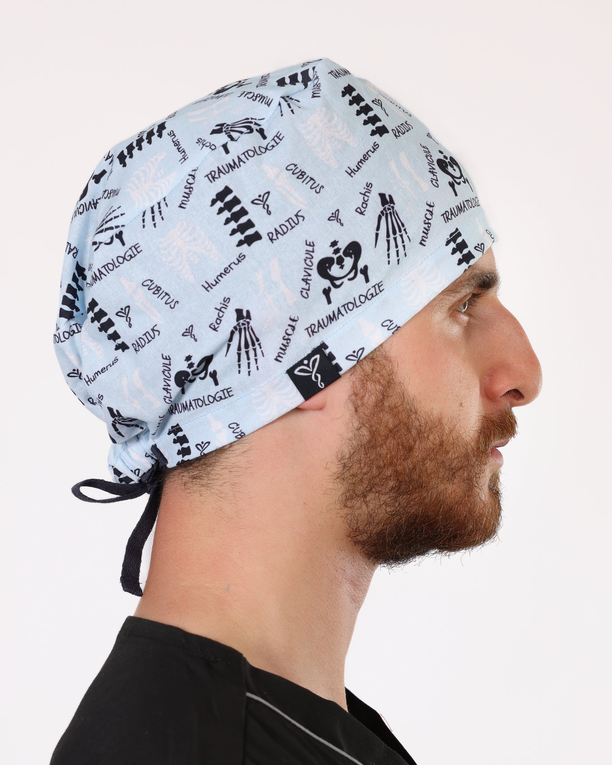 Ce calot met en valeur les mots-clés de la traumatologie accompagnés de motifs d’os humains : cage thoracique, bassin, main, genou… Un véritable clin d’œil à l’univers de l’orthopédie, de la chirurgie osseuse et de la rééducation.