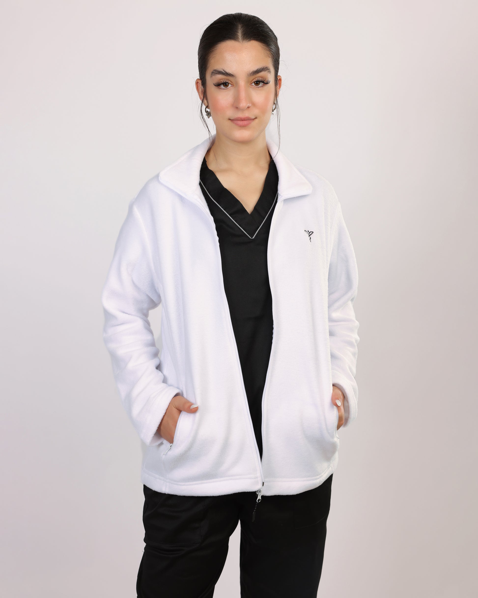 Veste douce et chaude, fermeture frontale avec zip et 2 poches latérales.